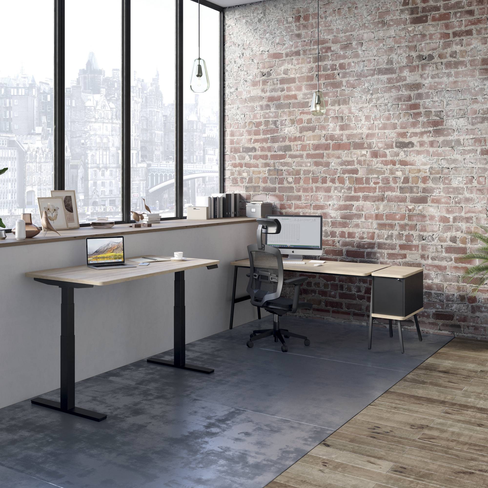 Motorized height adjustment system (motor integrated into each base), with adjustment control via “up & down” control box and 4 memorized positions with USB A and USB C 5v charging socket.