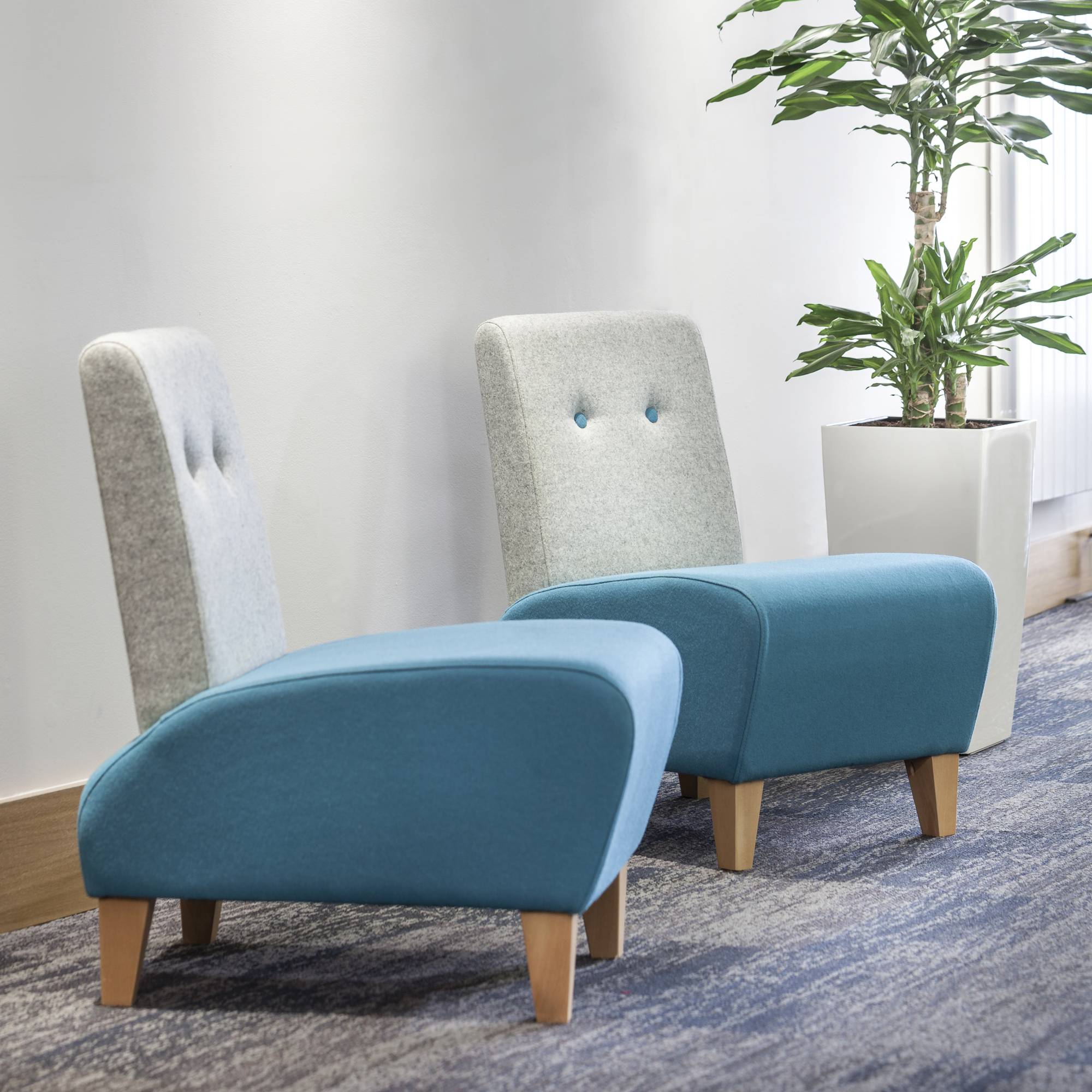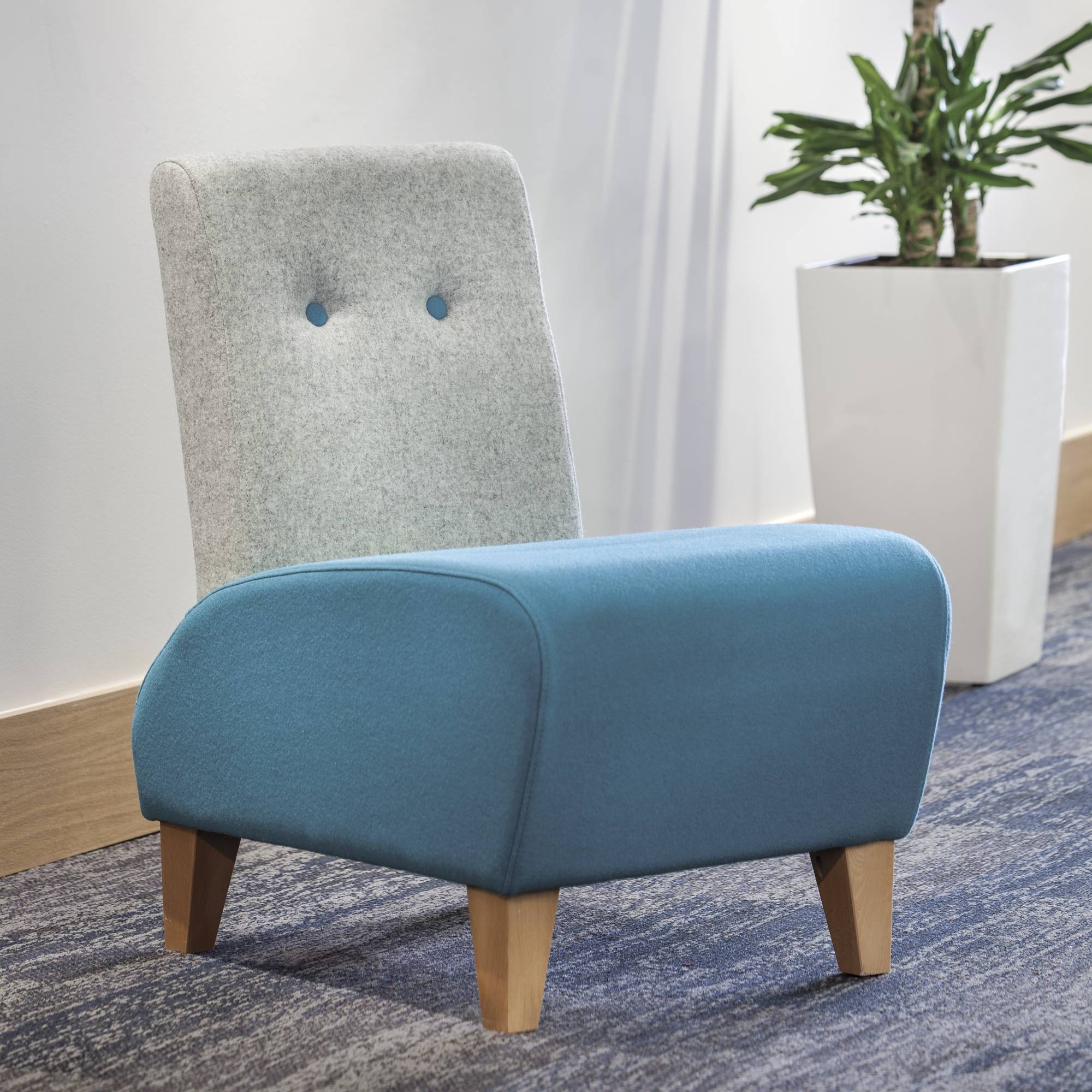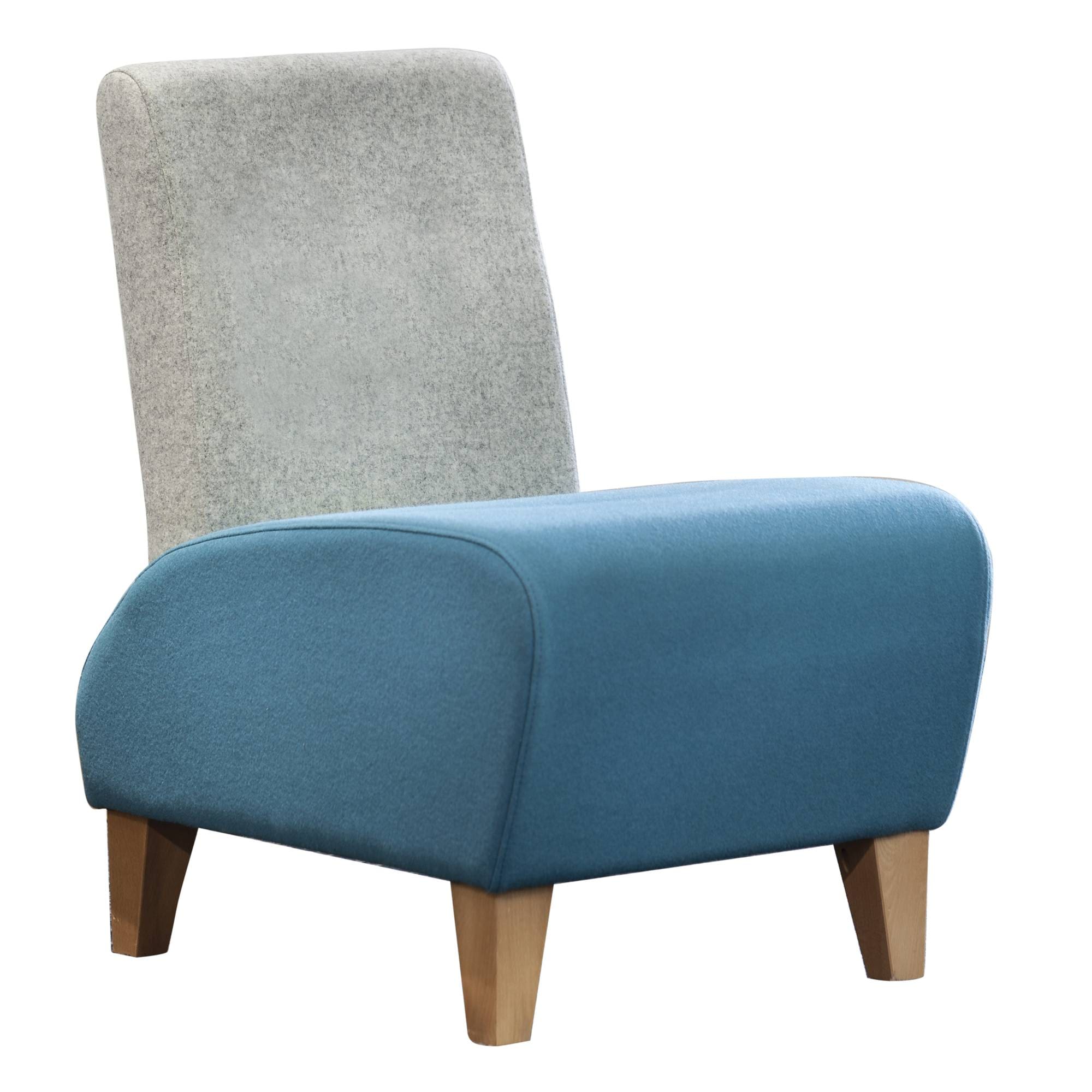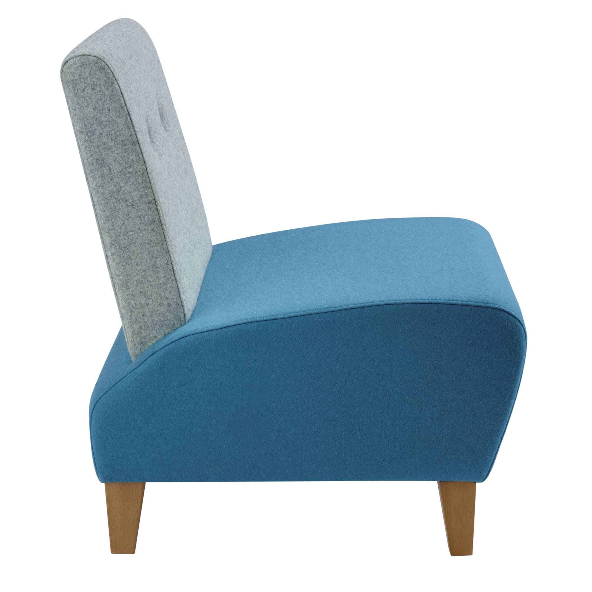 Fully upholstered single reception chair with shaped seat and natural finished wooden legs