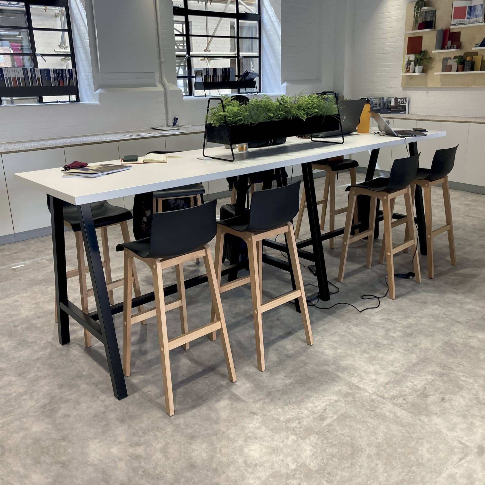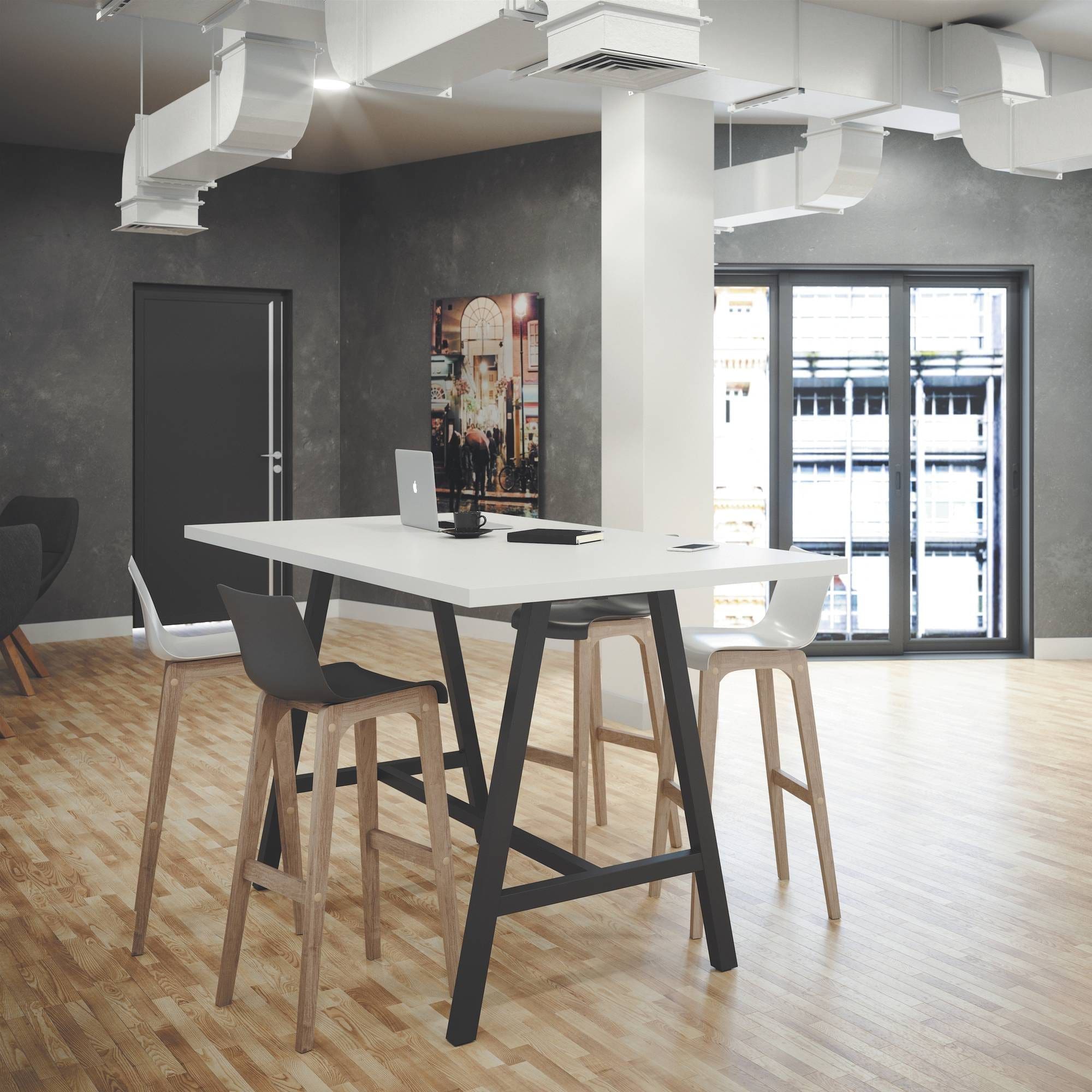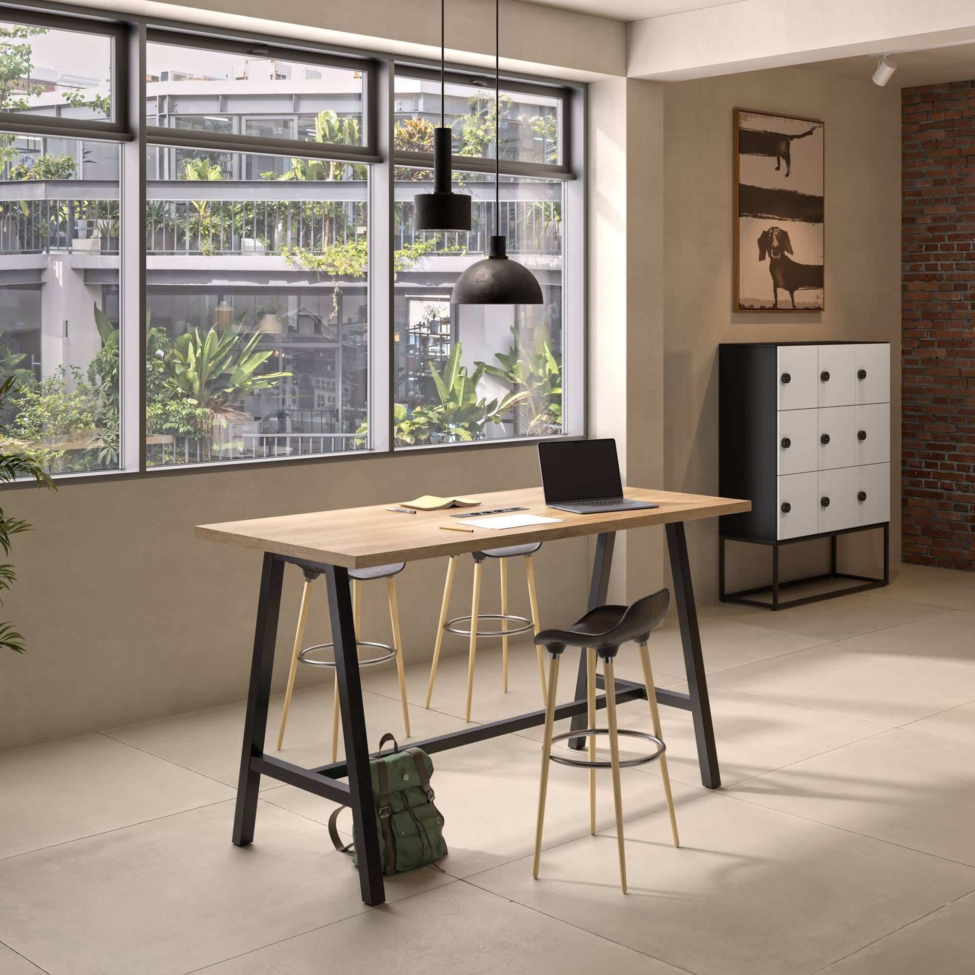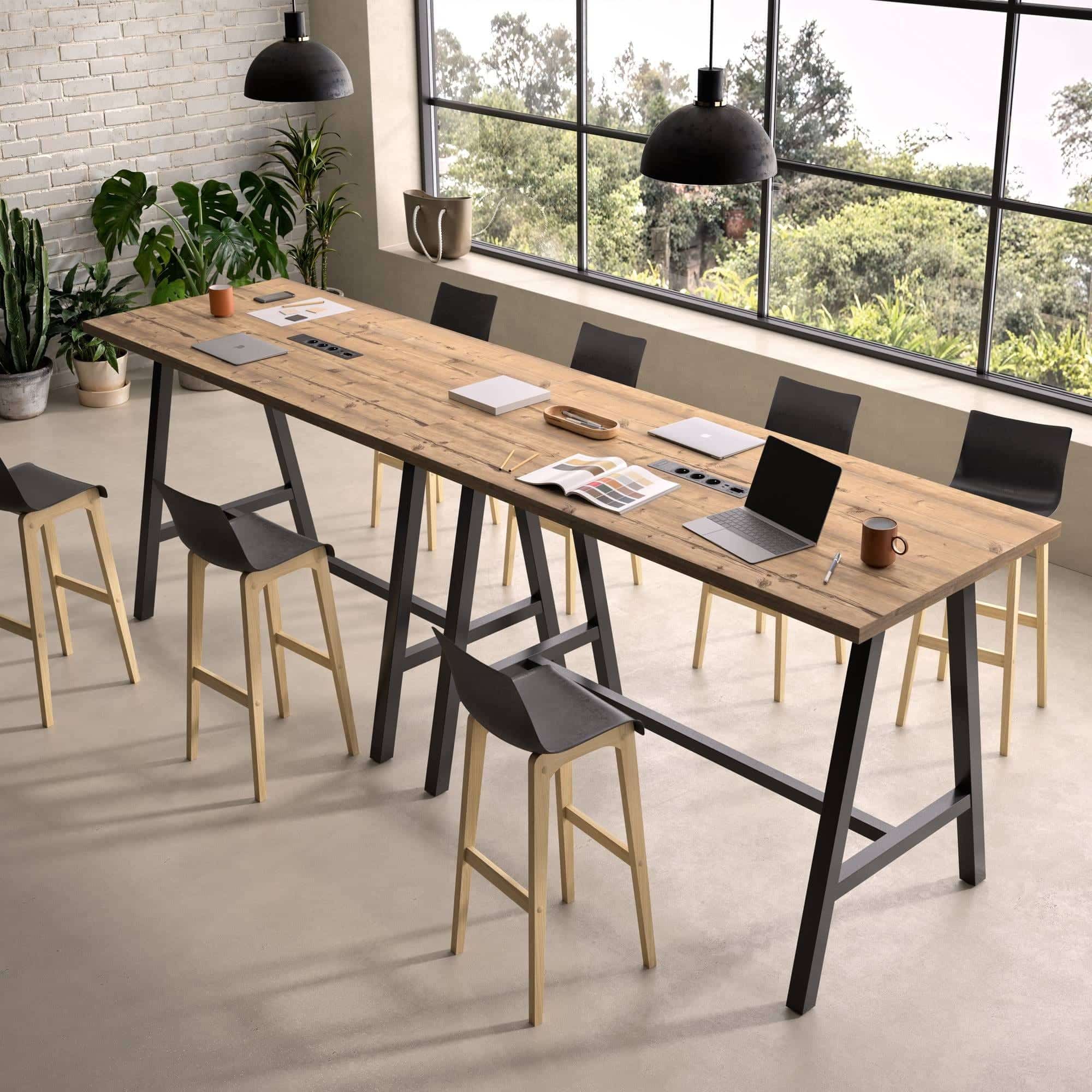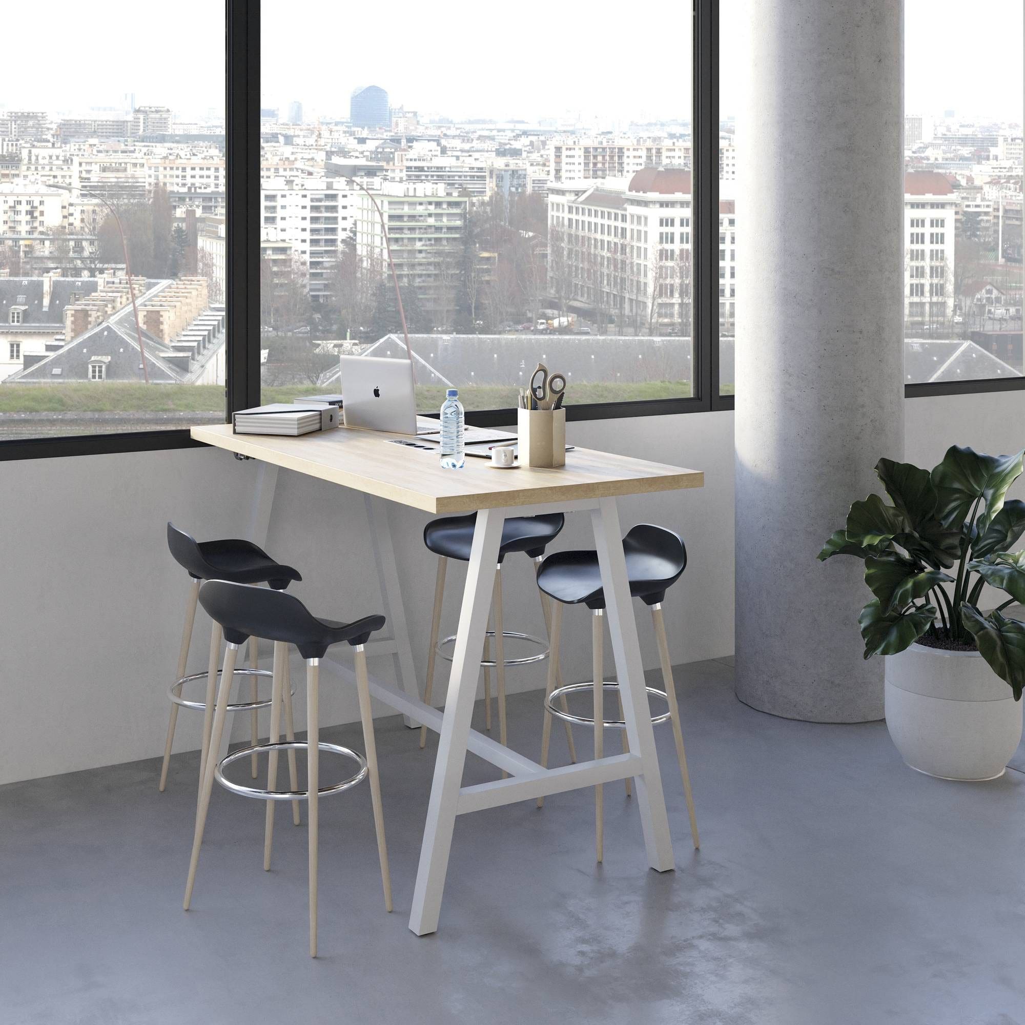 High tables equipped with a structural footrest bar, in epoxy-finished steel metal, measuring 40 x 40 mm. Height under footrest +/- 27 cm.