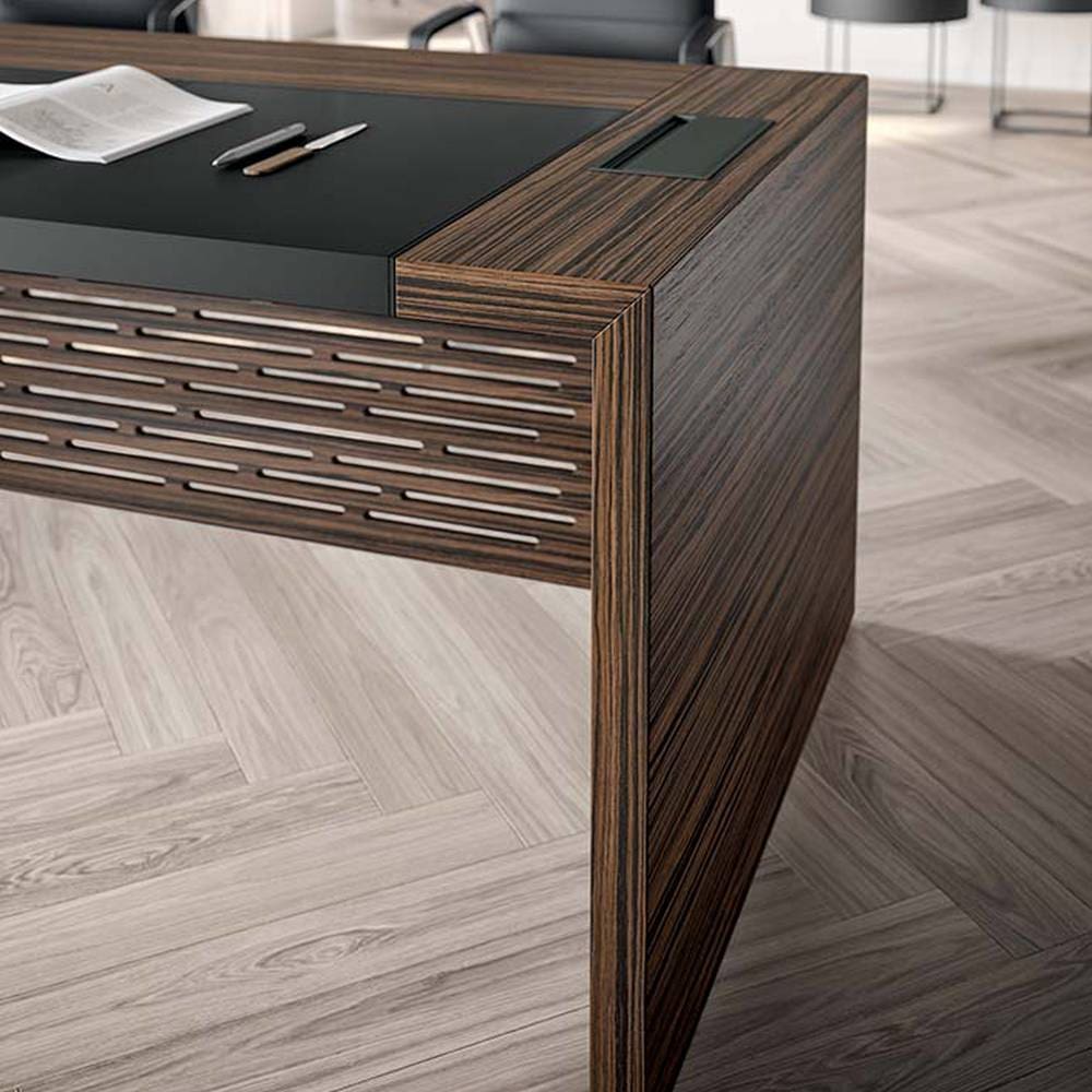 The evolution of the X10 line, with some modifications to shapes and finishings. With e-10, the legs and top engage in an unprecedented dialogue, devoid of a continuity solution, in a harmonious alliance and play of fullness and voids. The veneered wood, lacquered panelled or wooden legs and the top with leather inlays embellish the executive model. whereas other functional accessories, like the metal cable holder door, make the desk practical to use without undermining formal aesthetics. e-10 is also available in the version with a carved modesty panel, catering to international taste. Also available in the meeting table version, with different size and composition options.