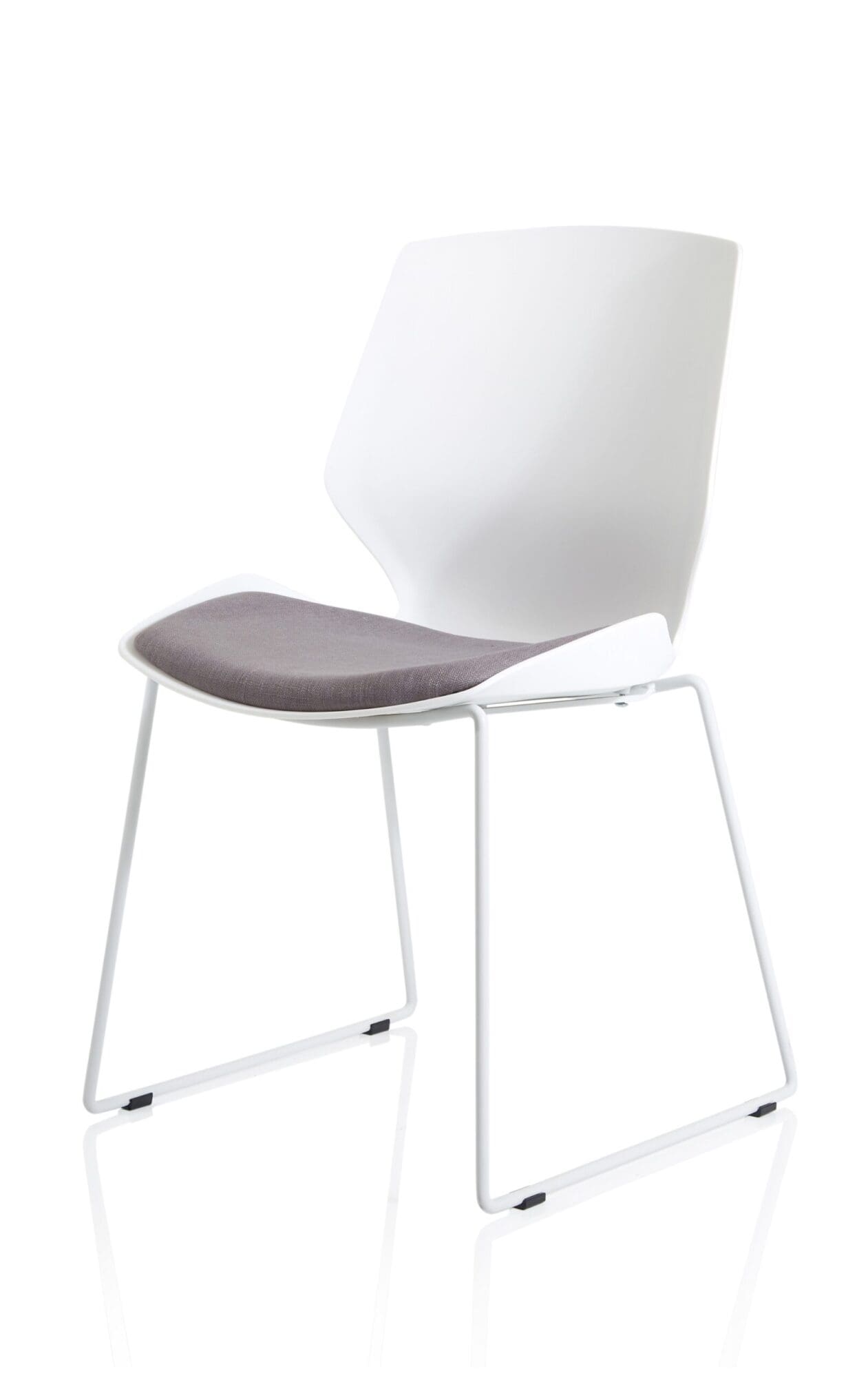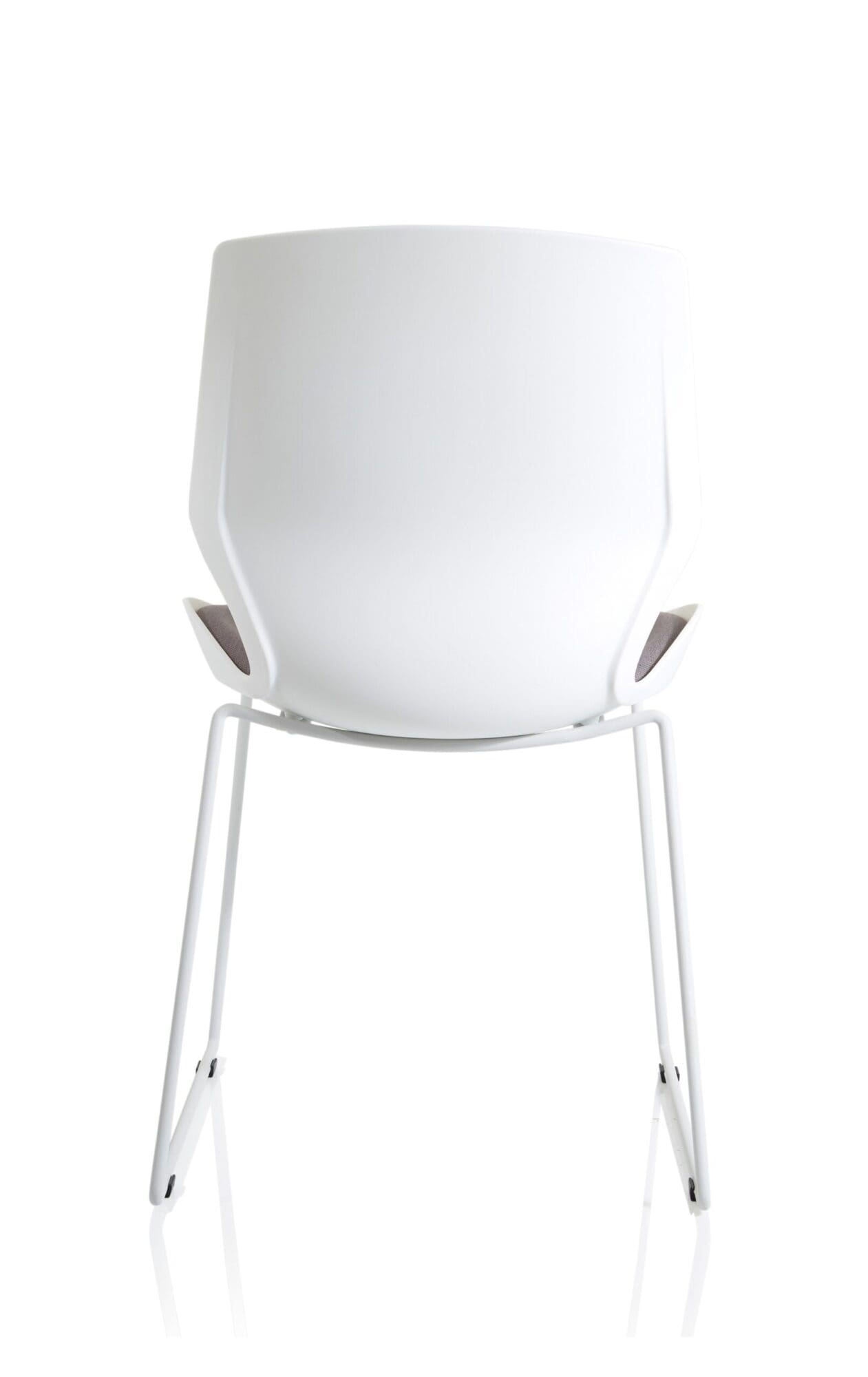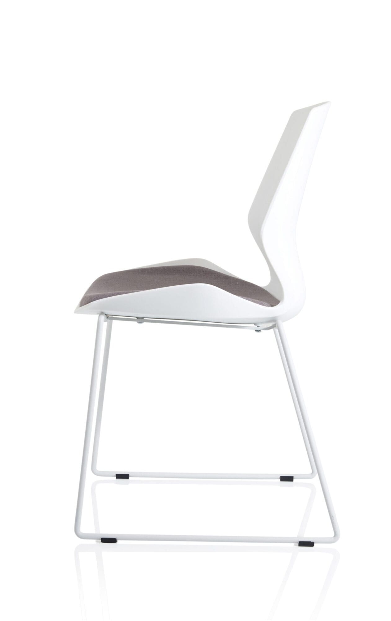 • Stylish white shell general purpose chair • Slate grey fabric upholstery • Skid base • Shaped backrest for lumbar support