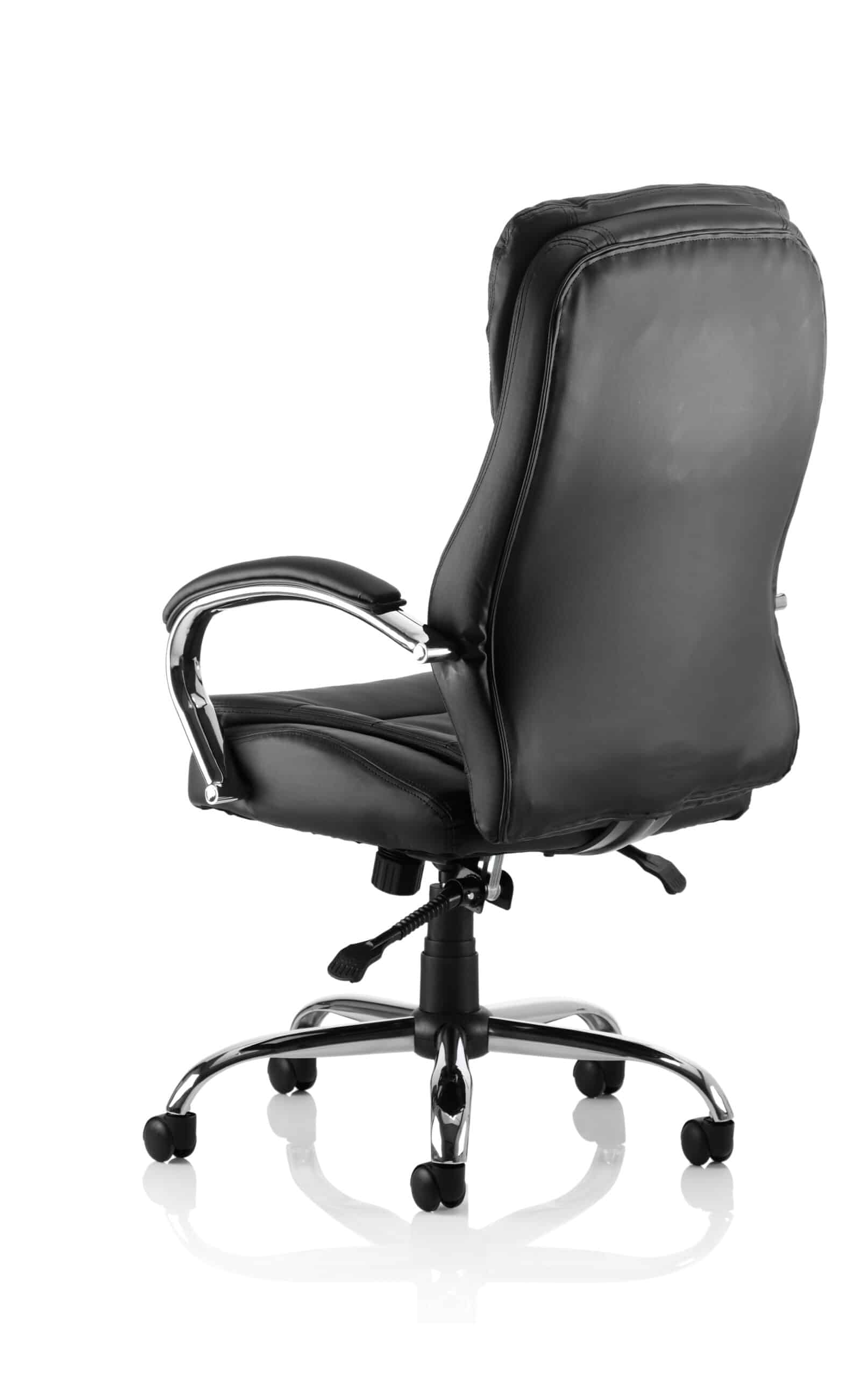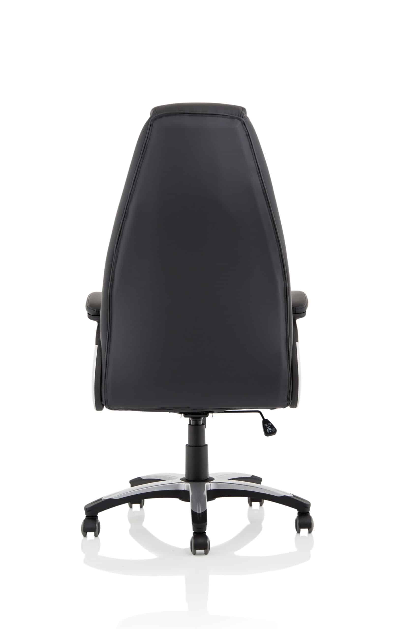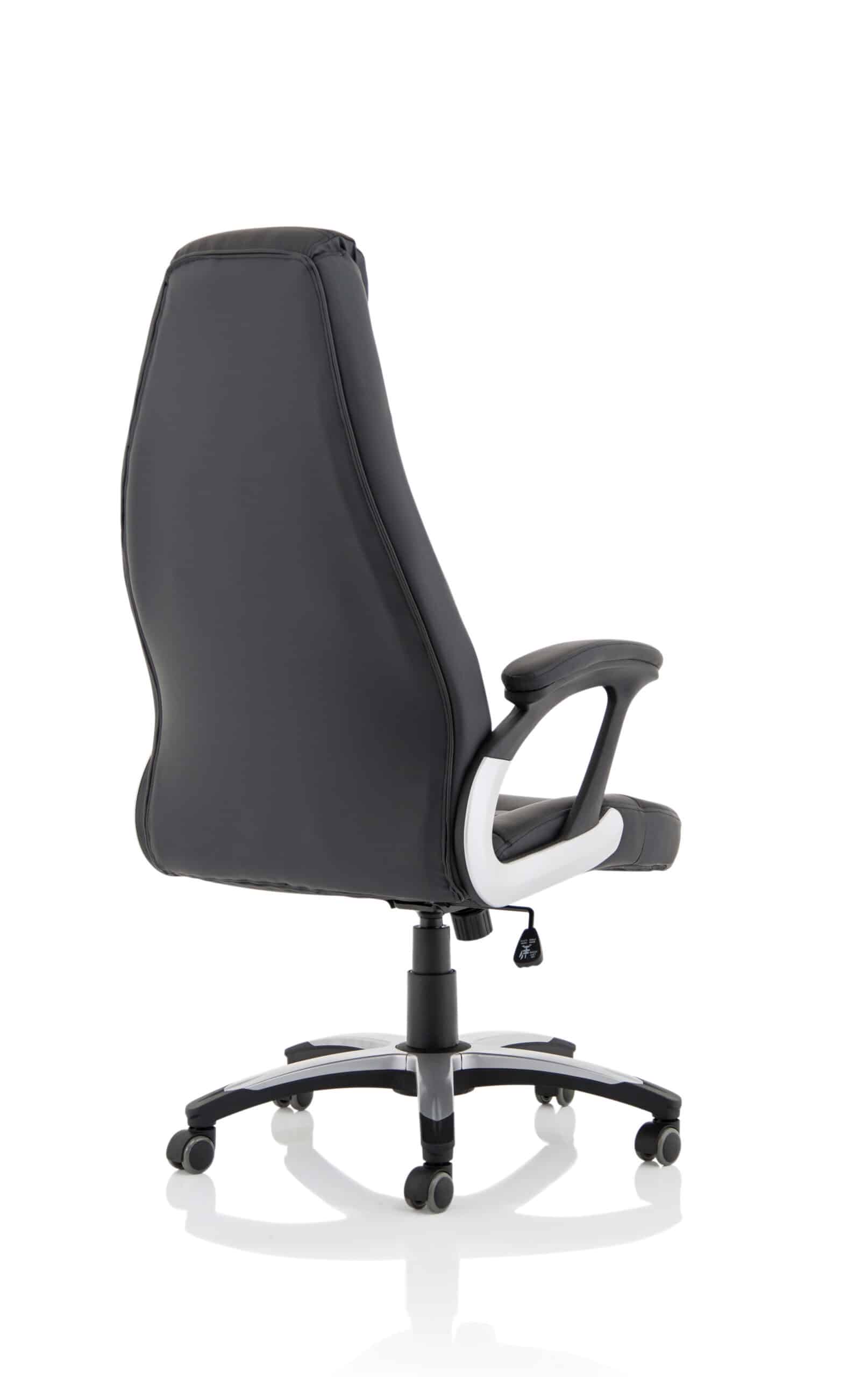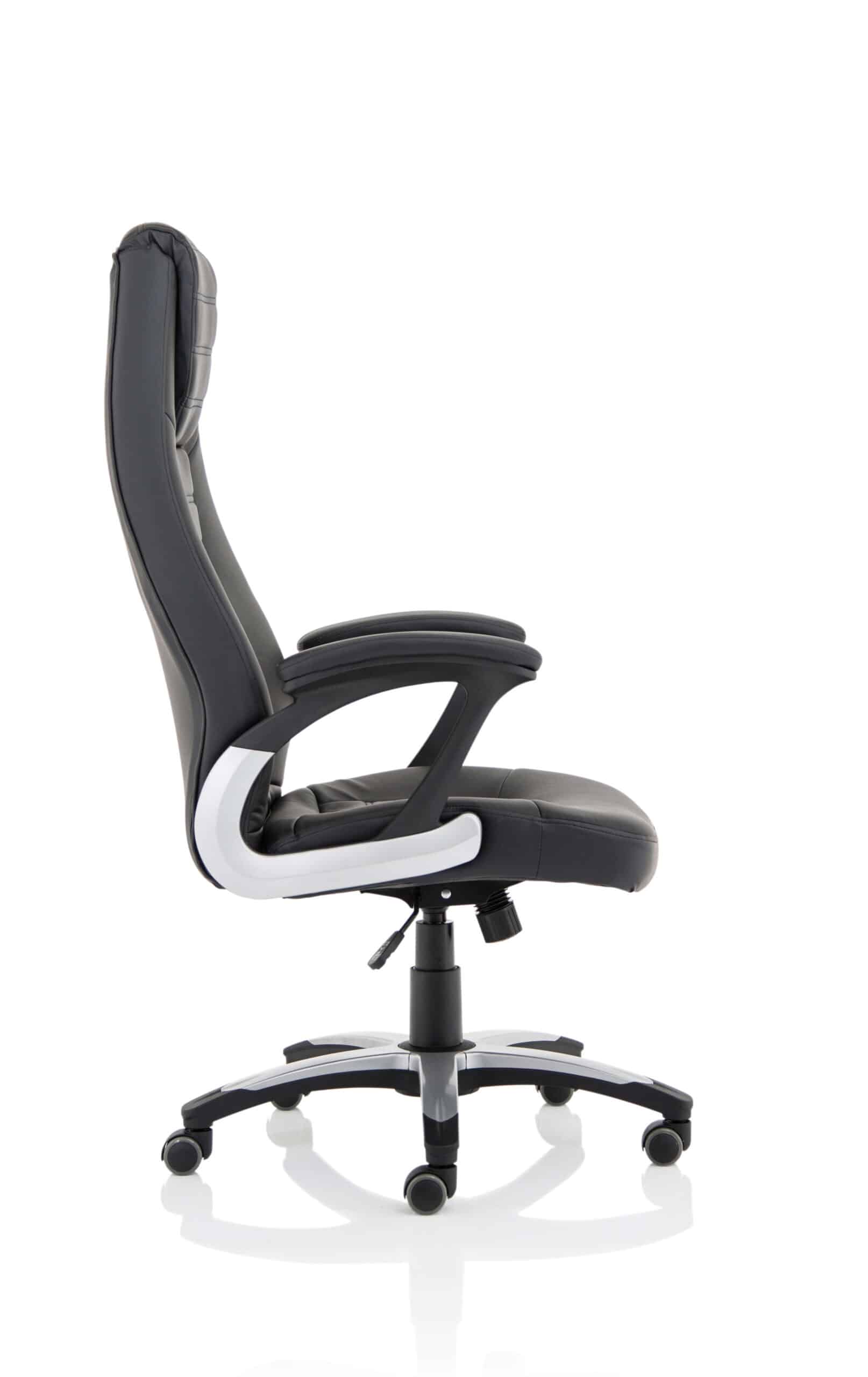 • Generously proportioned exec chair • Distinctive stitching detail • Lock and tilt action • Twin wheel castors • Lavish deep upholstery • Upholstered arms • Padded luxury styling to upholstery • Waterfall seat front • Five star security base • Gas auto lift • Tension adjustment to tilt • Lumbar shaping to back • Extra high backrest with head support