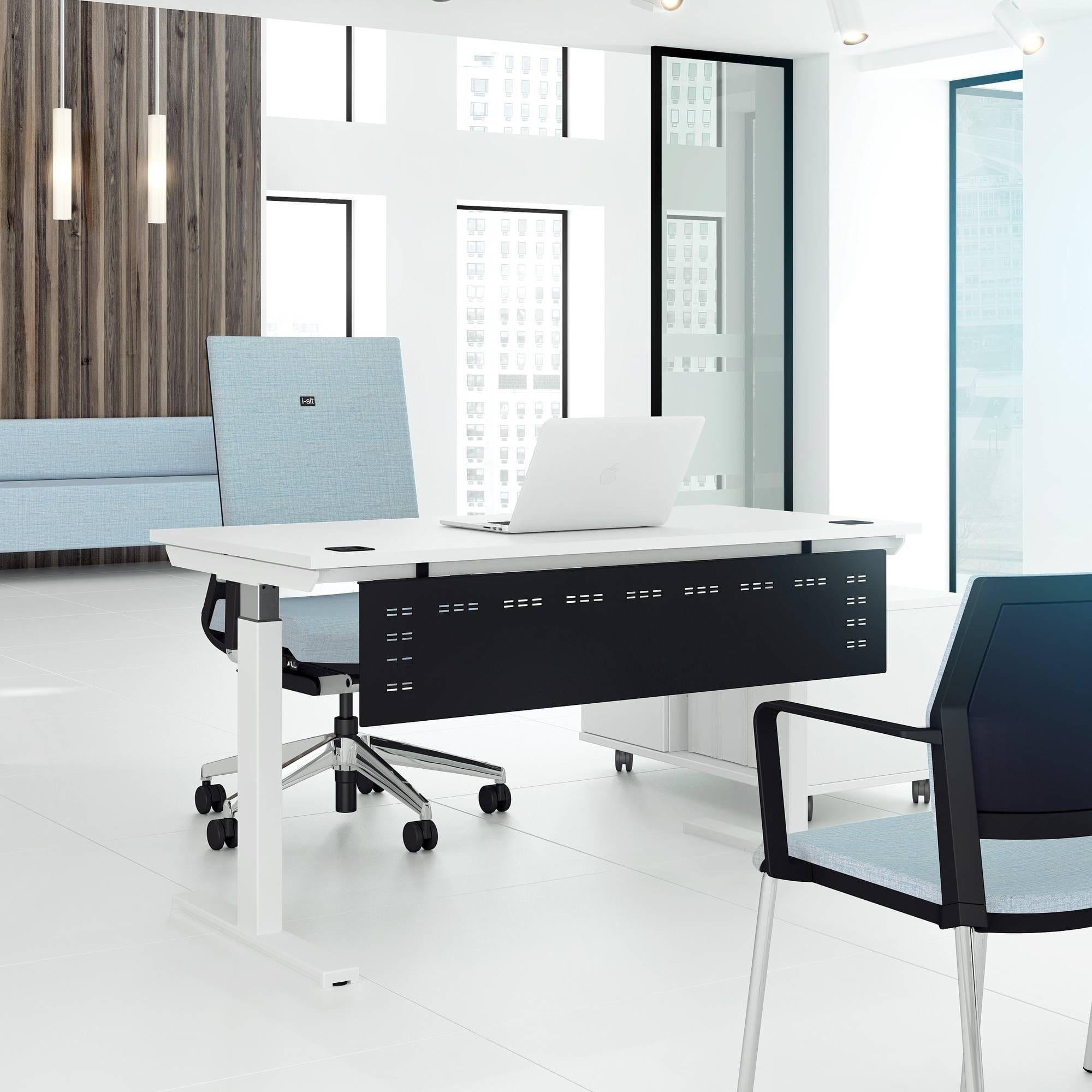 Progress offers complete flexibility with options including fixed height and gas strut height adjustment. Each option can be fitted after the initial installation, should the user’s requirements change. For example, a fixed height workstation can be converted to include height adjustment by swapping the leg uprights only. All components are fully interchangeable for maximum flexibility. The sit-stand aspect brings significant health benefits encouraging wellbeing within the office environment. Height adjustable workstations offer height variation from 685mm to 1185mm. Double benches are supplied with sliding tops as standard, enhancing the flexibility of the desking system. Horizontal wire management is inclusive under each desk top on both the single and double benches. Decorative slab end panels can be fitted to both single and double workstations to enhance the aesthetics at the end of a run of workstations, offering a more executive appearance.