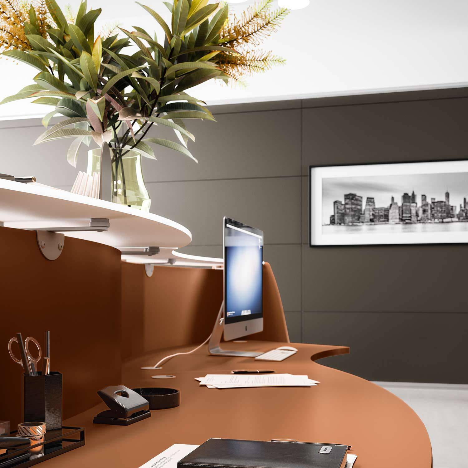 Soft and sinuous shapes envelop in a warm welcome and rounded lines accompany straight geometries to define reception and work areas. Reception Glass is the epitome of functionality: the configuration of elements can be selected according to aesthetic taste and work requirements. It adapts to work spaces and requirements in terms of shape, compositions, sizes and finishings; the addition of tall and low modules gives rise to an extensive selection of customisation options. The moulded work surfaces create a second working level in addition to the glass reception module. Complete with cable grommets, the surfaces ensure a tidy and efficient work.