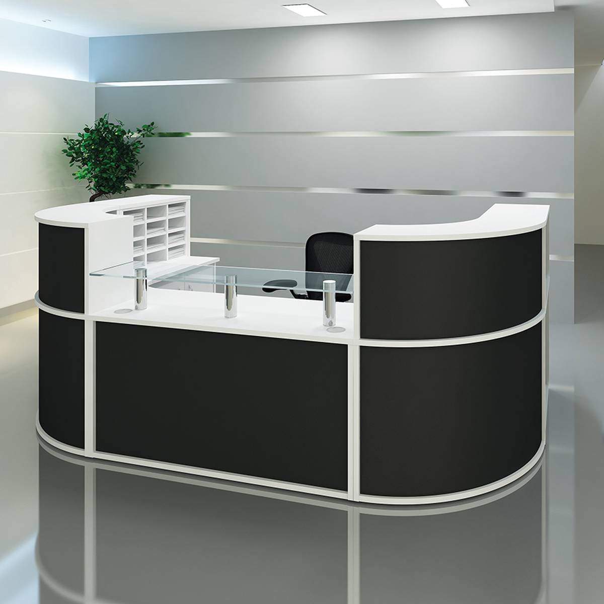 Receptiv is the most comprehensive modular reception range on the market. With numerous base units in various shapes and sizes, Receptiv can be planned in endless configurations to best fit your reception space. Choose between high and low top units or MFC and glass shelves to add privacy or a signing in area to your reception. Available in our choice of 17 board colours, as well as an extra 3 modesty panel finishes or a silver kick plate. Receptiv also provides specifically designed storage units that can be added for further practicality.