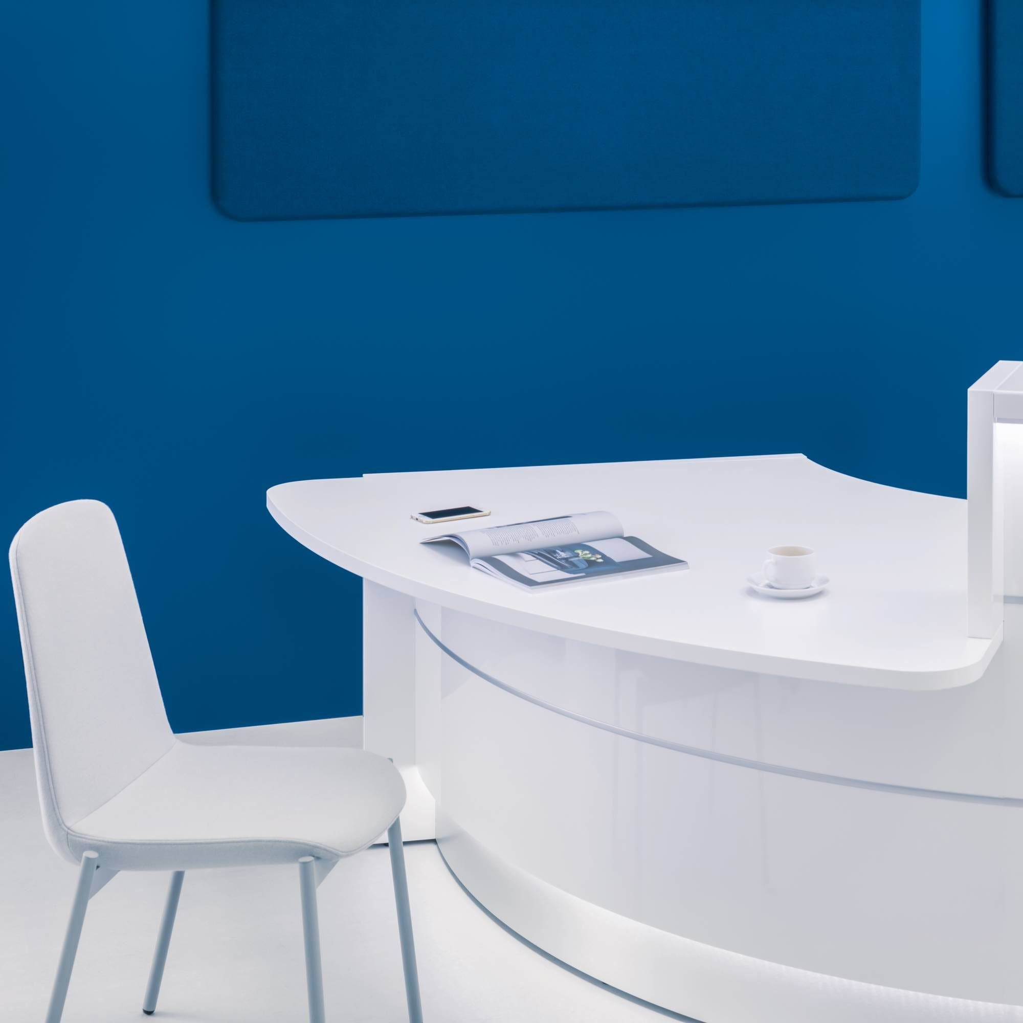 Modern character and dynamic form – Valde reception desk was designed to meet the requirements of a contemporary reception. Visually attractive combination of glass, aluminium and high gloss laminates creates an elegant, but not overwhelming whole. Modular construction allows to freely customize and extend the layouts. Corner desk, semi-circular, straight or an irregular shape – with Valde every configuration is possible. The overhang worktop of the low module is an indisputable advantage that is a convenience for disabled customers. Furthermore, the chosen colour can function as a complementary element of the visual identification of the company.