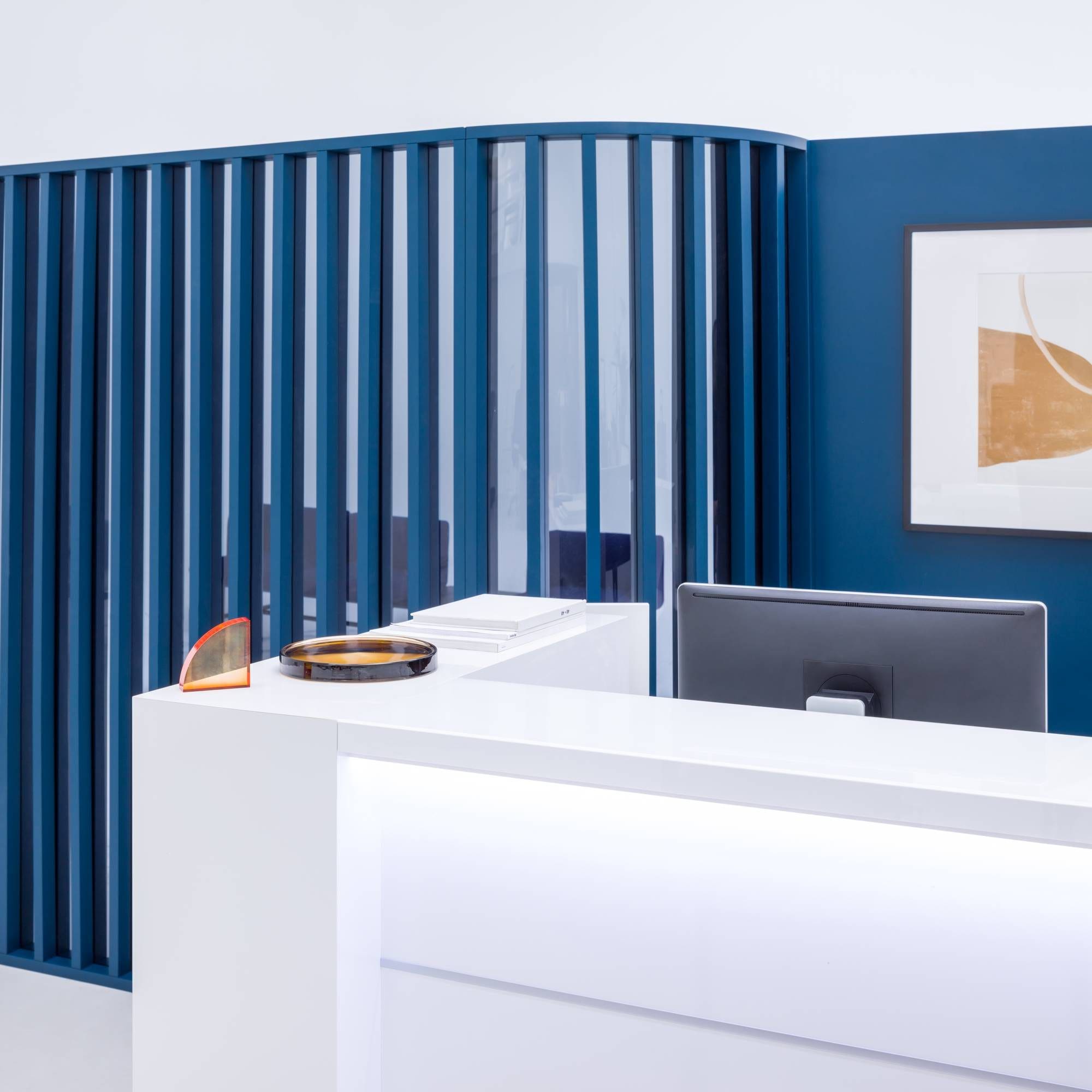 LED lighting at the full length of the reception desk elegantly draws the attention of people entering the reception area;