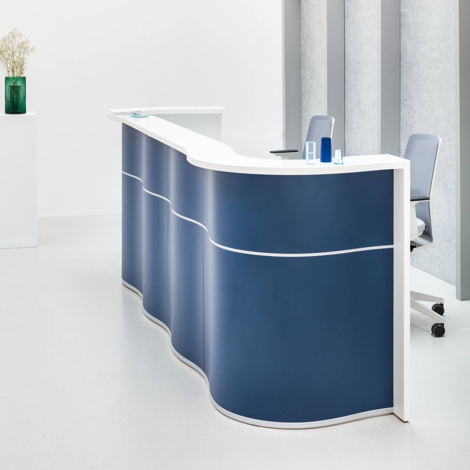 Wavy line reflecting strength and tranquillity of the dormant ocean — Wave reception desk stands out with is design. Simultaneously luxurious and professional character of this piece of furniture is emphasized by a white gloss of the worktop, glossy front and decorative aluminium bar. Modular construction allows creating customized configurations. Snail shaped reception helps to save space and at the same time provides functionality. An extended version of the desk can consist of several workstations whereas employing a low module with overhang top is a convenience for disabled customers. The characteristic form don’t overwhelm the interior, but it attracts attention