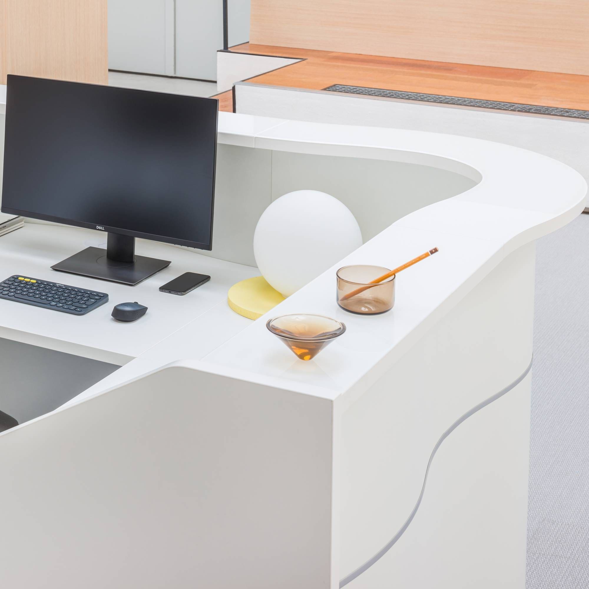 Organic HPL front gives the reception desk a representative character;