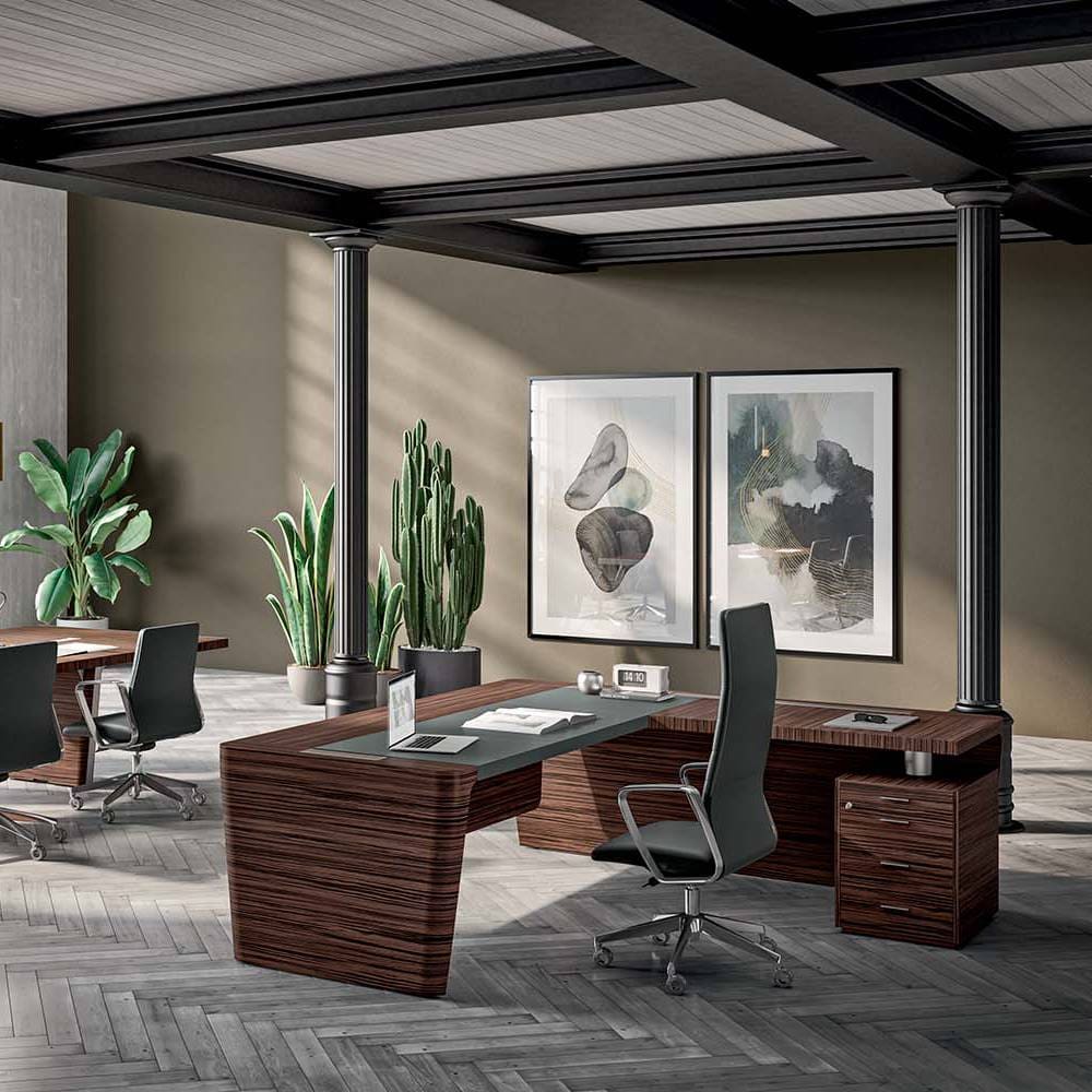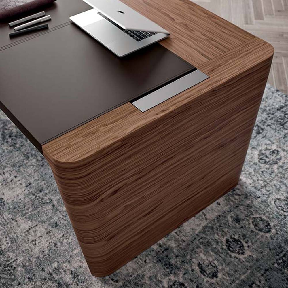 This desk is a triumph of finesse and manual flair, a sculptural and enveloping top with curved wood, tamed by artisan craftsmanship. The soft lines and refined finishings of the legs and top express a design that is pondered, yet of immediate effect. X10 distinguishes itself due to its proportions, which enable precision and perfection, culminating in functional and aesthetic comfort. Also available with leather inlay, the textured and rich pairing of wood and hand-sewn leather brings to life contemporary compositions that are well suited to prestigious executive interiors and boardroom meetings, conveying a cosmopolitan managerial style. Also available in the meeting table version, in different sizes and compositions.